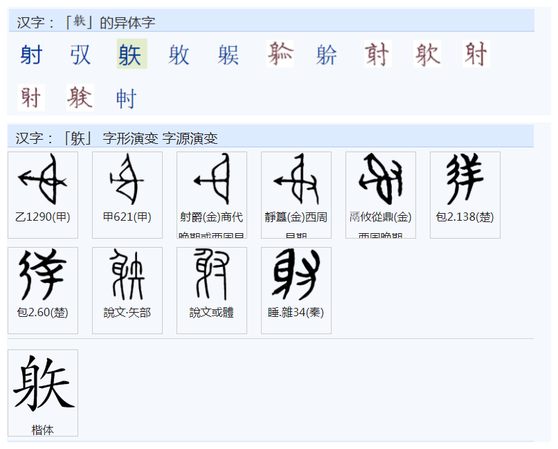 《说文解字》:“,弓弩发于身而中于远也。从矢、从身。射,篆文从寸。寸,法度也。亦手也。”