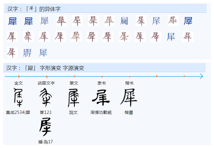 《说文解字》:“犀,南徼外牛。一角在鼻,一角在顶,似豕。从牛、声。”。