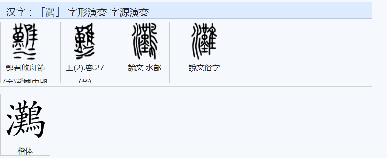 《说文解字》:“滥,氾也。从水、監声。一曰:濡上及下也。《诗》曰:‘沸濫泉。’。一曰:清也。”。
