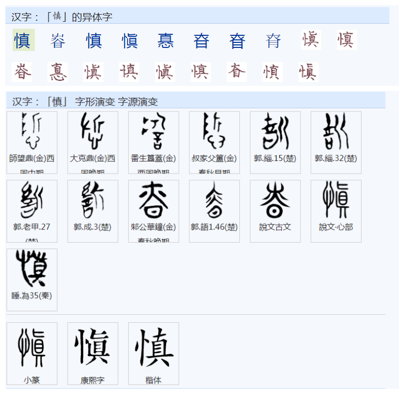 《说文解字》:“愼,谨也。从心、眞声。”。