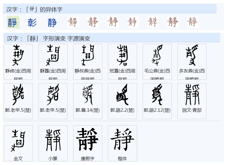 《说文解字》:“靜,審也。从青、爭聲。”。