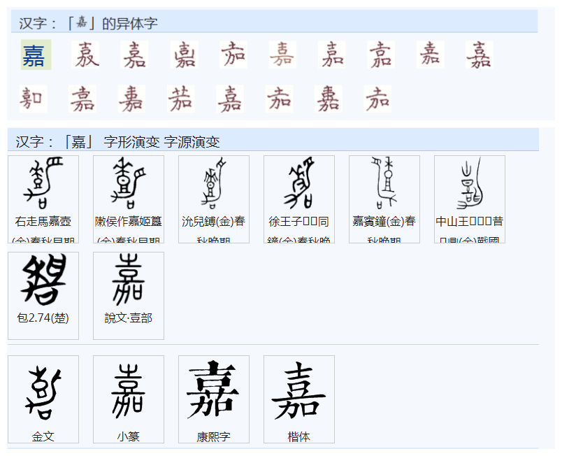 《说文解字》:“嘉,美也。从壴、加声。”。