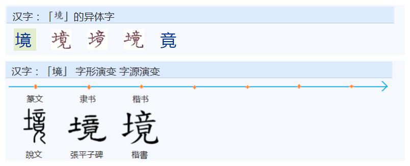 《说文解字》:“境,疆也。从土、竟声。经典通用竟。”。