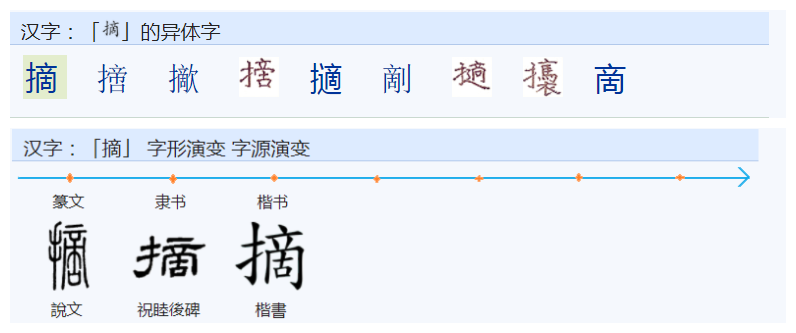 《说文解字》:“摘,拓果树实也。从手、啻声。一曰指近之也。”。