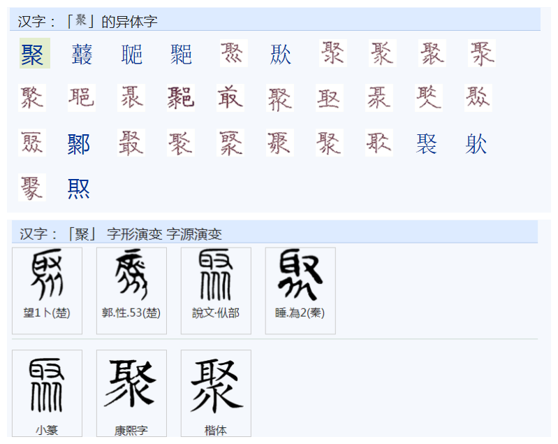 《说文解字》:“聚,会也。从乑、取声。邑落云聚。”。