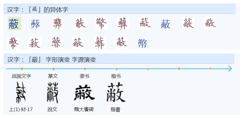 《说文解字》:“蔽,蔽蔽,小艸也。从艸、敝声。”。