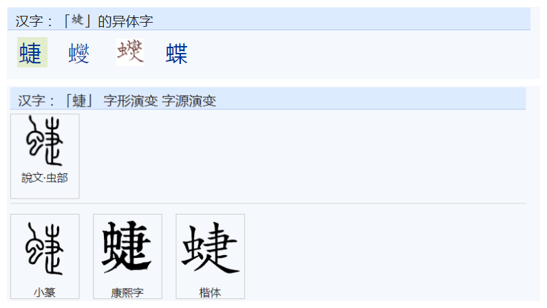 《说文解字》:“蜨,蛱蜨也。从虫、疌声。”。