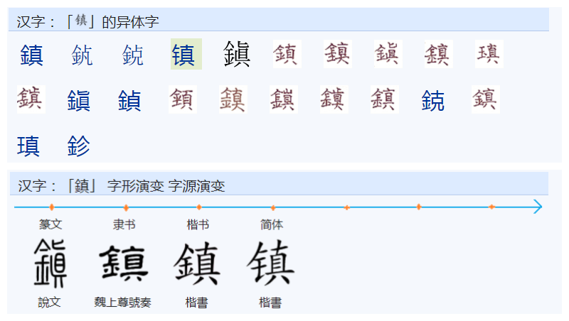 繁体字“鎮”简化为“镇”是根据古人(异体字、同旁字)书法省笔规范简化。