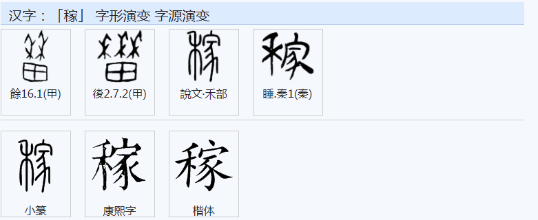 《说文解字》:“稼,禾之秀实为稼,茎节为禾。从禾、家声。一曰稼,家事也。一曰在野曰稼。”。