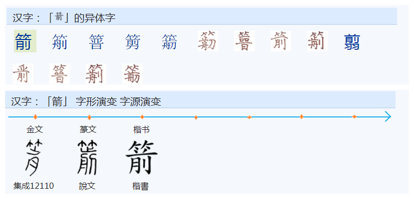 《说文解字》:“箭,矢也。从竹、前声。”。