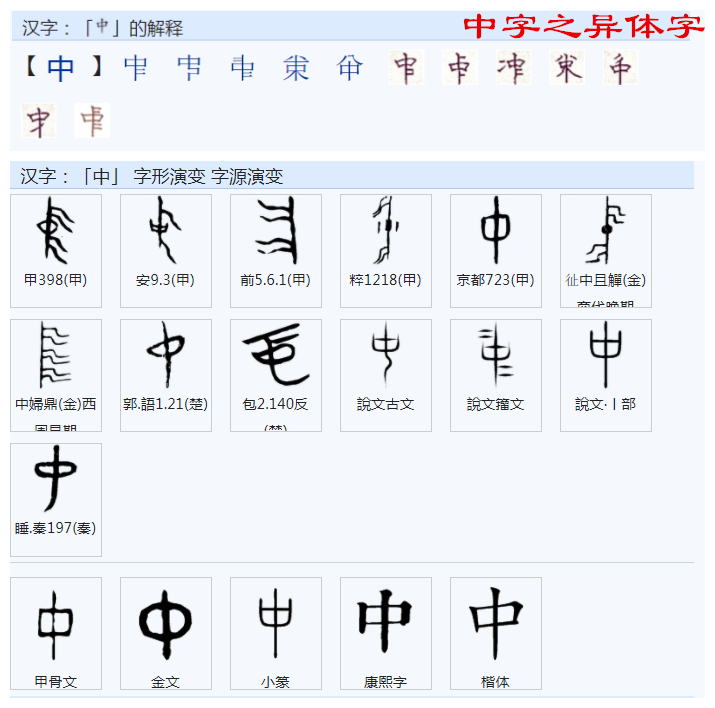 《说文解字》:“中,内也。从囗、丨,下上通也。”。“囗、丨”两范式叠加。犹种子生根发芽上下通指向于外壳以内者是中字之范式。相对种子外壳之内是种子的中间。相对种子外壳之内核是种子的中心。中是一个相对的认识。世界是一个相对的认识,这是世界观。