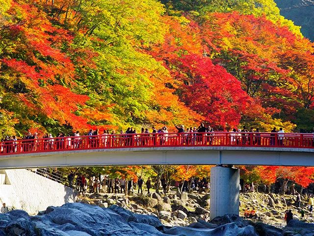 来层云峡,可以顺着登山的道路,边走边欣赏;也可以乘坐缆车,从空中俯视斑驳如画的红叶美景。