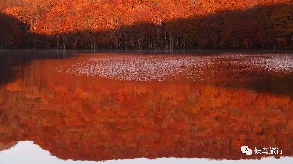 曙光照射的那一刻,岸上铺天盖地的红叶倒映在水中,如同火烧一般蔓延开来。