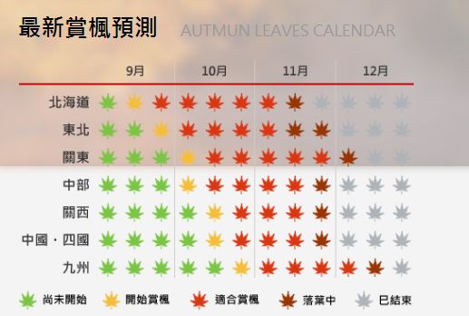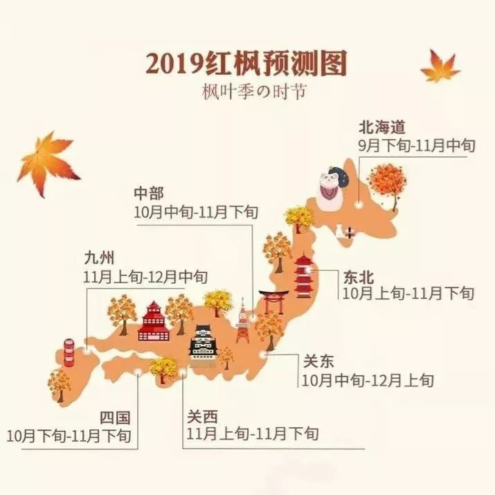 在这段时间里,由北向南,枫叶逐渐变红。11月是枫叶正红也是最好看的时候,到12月之后,红叶逐渐落尽。这就是“红叶前线”。