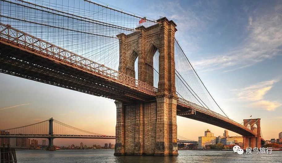 布鲁克林大桥建成于1883年,是当年世界上最长的悬索桥,也是世界上首次以钢材建造的大桥,曾被誉为世界第八大奇迹。后来在它旁边又建了曼哈顿大桥,两座桥都经常出现在电影里,容易混淆,不过只要记住其中特征还是很容易区分的,布鲁克林桥是砖石桥墩,双拱门,曼哈顿大桥是钢铁桥墩,单拱。其中经典电影《美国往事》海报上的便是曼哈顿大桥。
