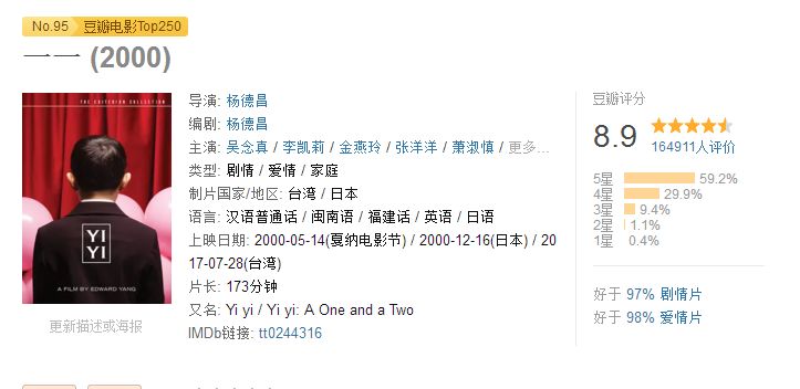 经典指数:自从电影发明以后,人类的生命就至少延长了三倍《一一 (2000)》杨德昌获嘎纳最佳导演奖的影片,近三个小时的影像细腻而漫长,其间没有大起大落,只是一直温和的诉说,可看这平淡的真实,却叫人沉重起来。