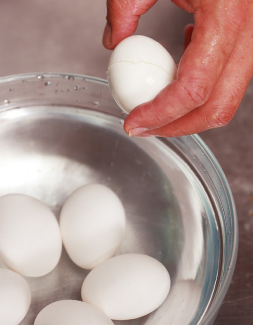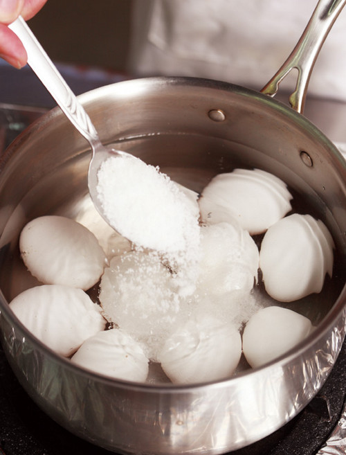2、水中加入少许盐。万一蛋壳不小心破裂时,流出的蛋液会因为遇到盐水而瞬间凝结,比较不会完全流出。