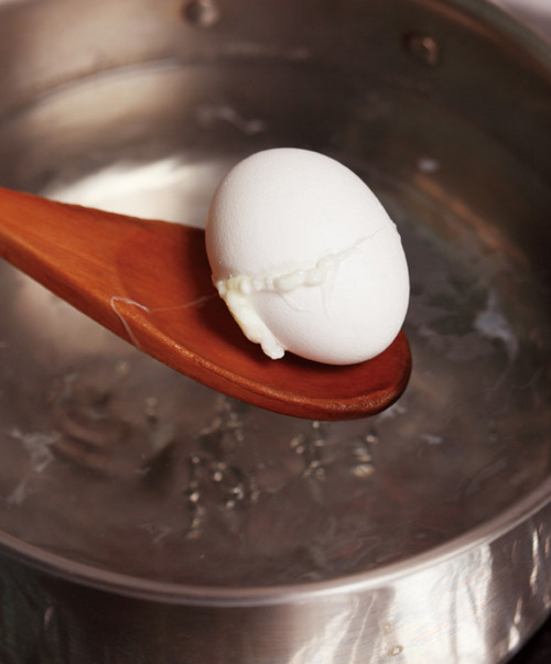 错误示范:将水煮滚后才放入鸡蛋,因为温差大,热胀冷缩易使鸡蛋破裂。