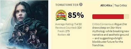 主流口碑网站也给了《侠盗一号》不错的评分。烂番茄新鲜度85%