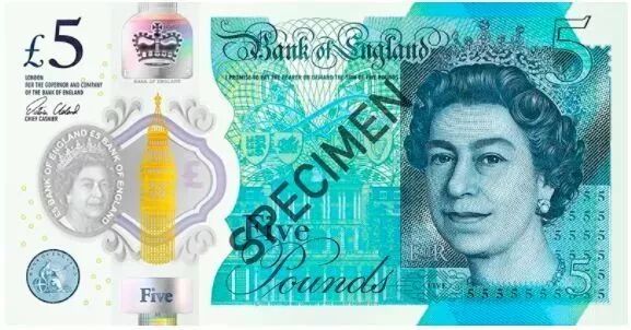 新发行的五镑正面为女王头像,反面为温斯顿·丘吉尔的头像,丘吉尔头像的背景为他获得的诺贝尔文学奖奖牌、他的出生地布伦海姆宫以及议会大厦的标志大本钟。