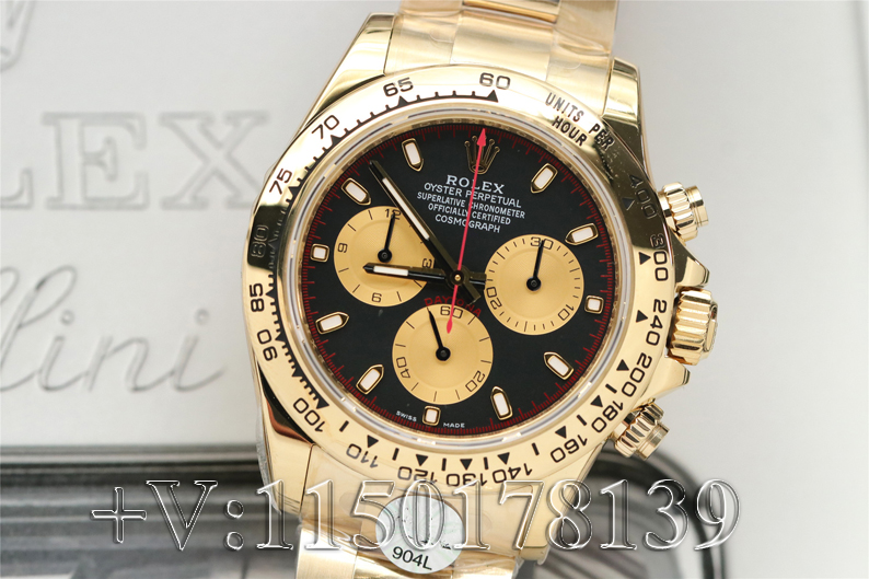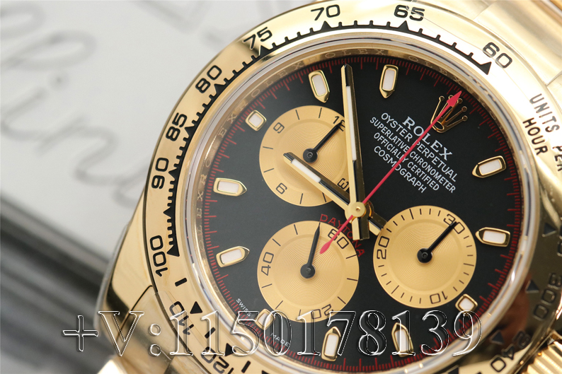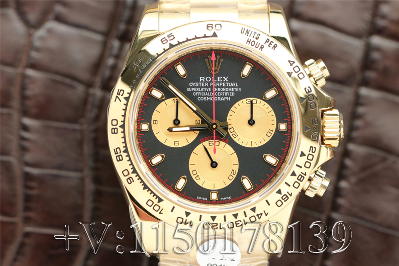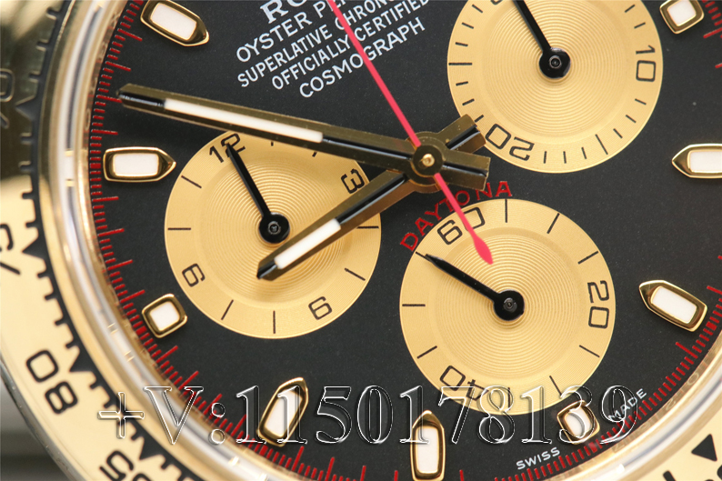 AR劳力士迪通拿黑金迪M116508表盘直径为40毫米,镜面采用蓝宝石水晶镜面,经过防眩目处理,盘面以纯黑底色铺垫,三个小盘为黄金色构成。指向12点位的红色长针为计时秒针、3点位小盘为计时30分钟显示、6点位小盘为秒针显示、9点位小盘为计时12小时显示,所有时标刻度和时分双针均采用夜光填充效果。