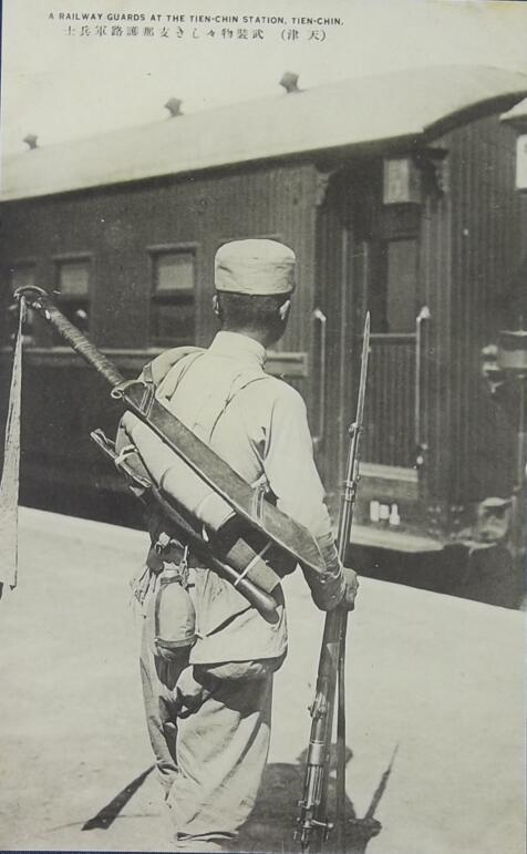 这是天津一个守卫火车站的中国士兵。大刀格外显眼。