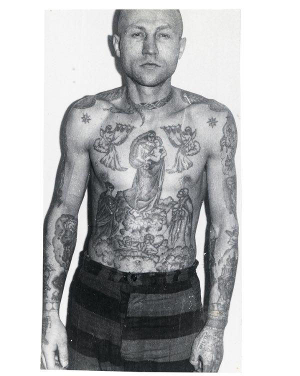 这也是个坐牢的俄国阿飞。很多黑帮分子都喜欢在身上纹圣母、天使。它有多种含义,比如,代表着对犯罪家庭的忠诚。又或者,代表他从小就坐牢。(本图作者 Arkady Bronnikov)