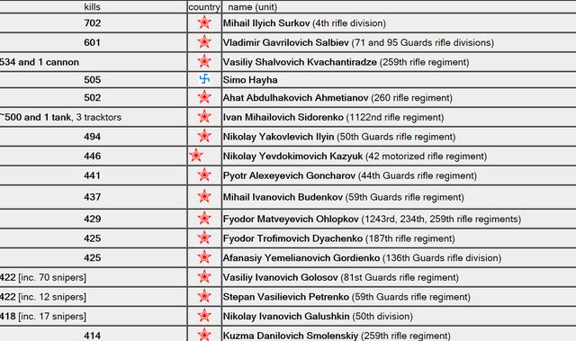 从中看到西蒙·海耶的战绩是505人,而网上有资料显示,其从军生涯中共击杀705人。乃是二战狙击手第一名。