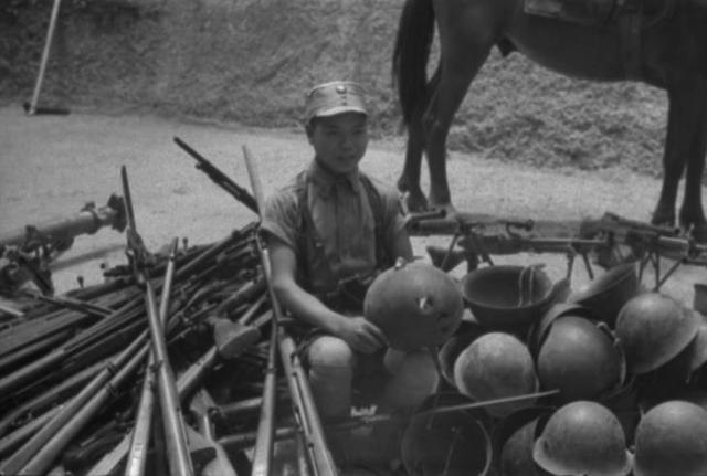 下面这张拍摄于1942年,中国军队跟日军战斗之后,缴获了很多武器装备。