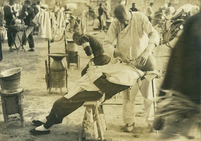 眼尖的朋友应该看到了,剃头匠身后的小孩,以及左上角的男子,手臂上都戴着白箍。