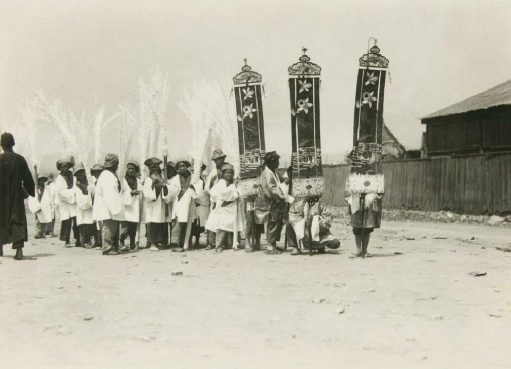 这一行列,正准备出发,打头的是三块莲花纹宝幡,后面跟着身穿白衣的半大孩子,他们举的,名为雪柳。