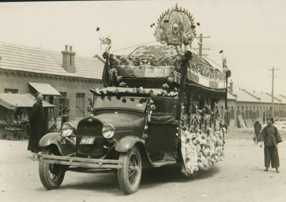 这是卡车改装而成的灵车,顶有光轮,下有宝盖,两边饰以花环,四角皆为含着如意的龙首。