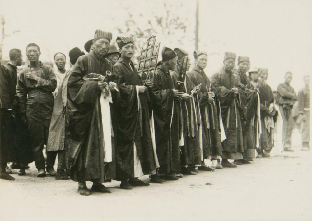 和尚在灵堂吹吹打打,道士们,则站在外面,等候着送逝者上山。