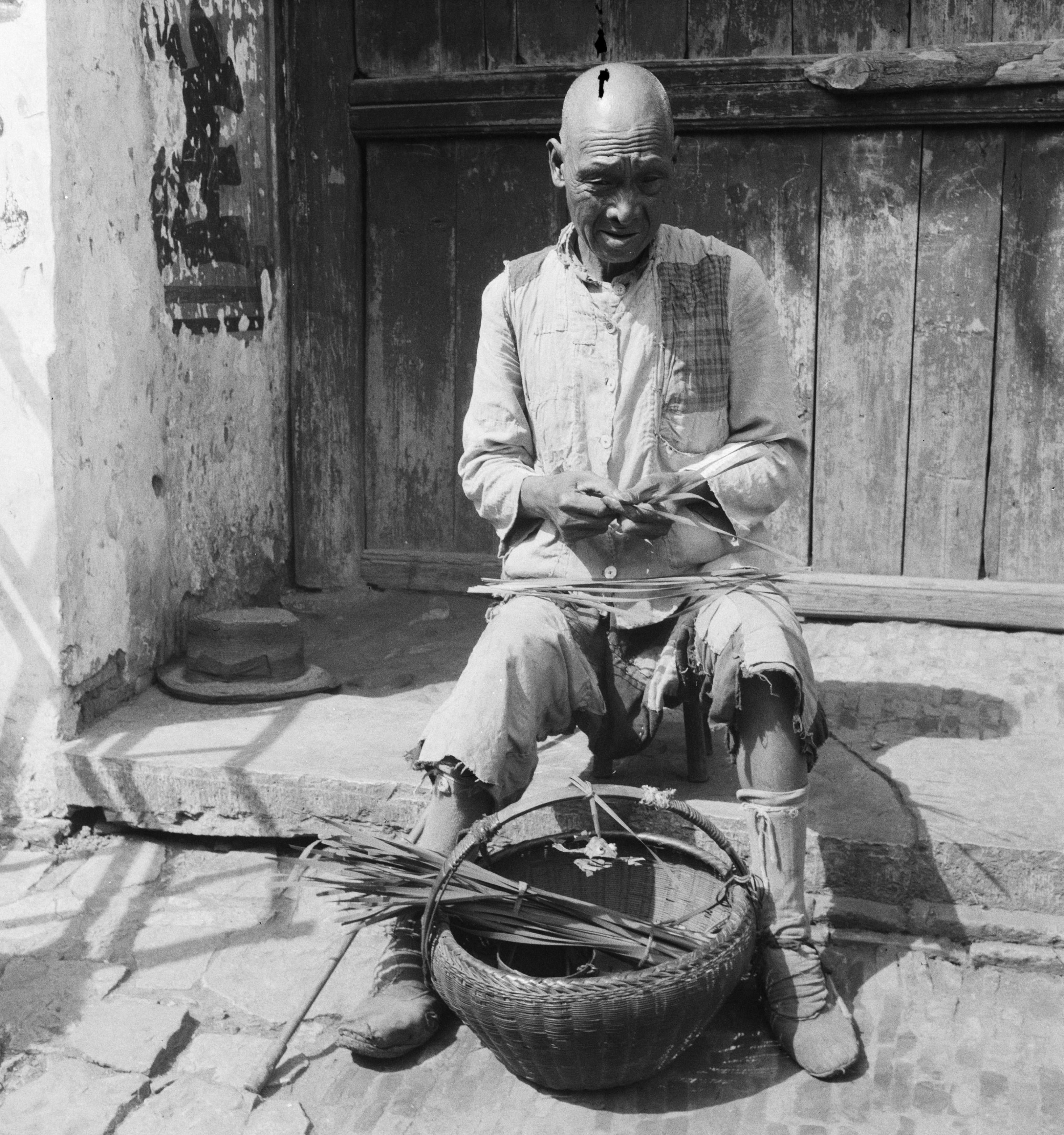 这位衣衫褴褛的老者,饭篮里放着几把棕叶,篮柄上吊着一只小青蛙。手里正在摆弄着,不晓得又会做出个什么玩具来。
