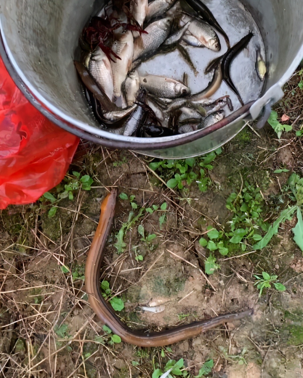 今早龙虾田里起网,“捉”到一条大黄鳝。