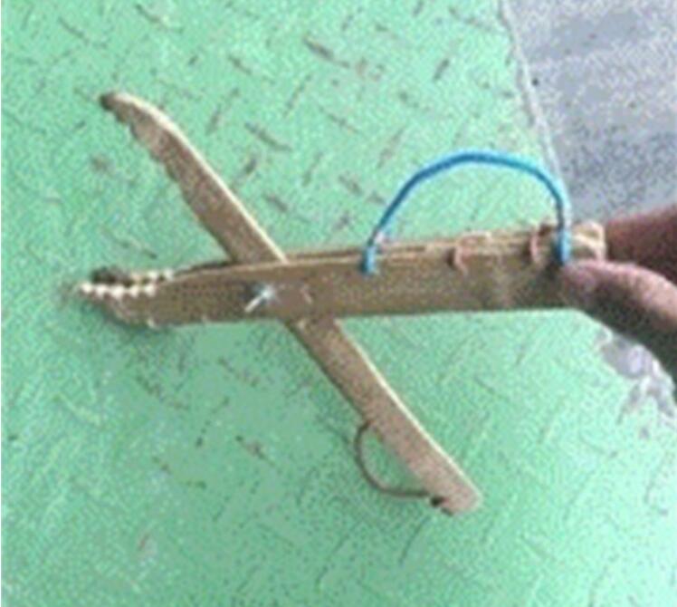 另一块从缝中穿过,对中三孔,绑以铁丝,夹子就做好了。