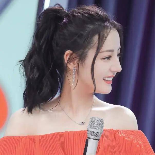 迪丽热巴梳着松散的马尾辫,穿着一字肩橙色短袖,她的耳朵上戴着流苏式耳坠,仙气十足,她的项链是银色细绳加中间的饰品,设计得很像一个扣在一起的锁。