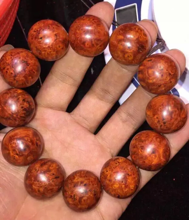 陈化料(陈化料,顾名思义就是崖柏死亡后内质发生变化,放置的时间越久,陈化的时间就越长,自然陈化的时间越长,味道越醇厚,油性也更好)。崖柏的顶级手串就是拥有瘤花,此条手串颗颗珠子四周云纹满瘤花,瘤花极密,不是一面有瘤花,360度全身满瘤花。云纹,就像变化莫测的云彩,通常只有油性非常足的老红料才会有的云纹纹理,老红料经过长时间的陈化,实属非常难得,肉质细腻红润,含油量丰富,年轮细密,花纹绚丽,香味以甜味为主,略带药香味、清凉味,香气清幽绵长。