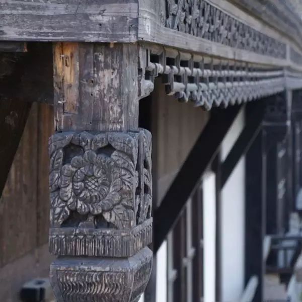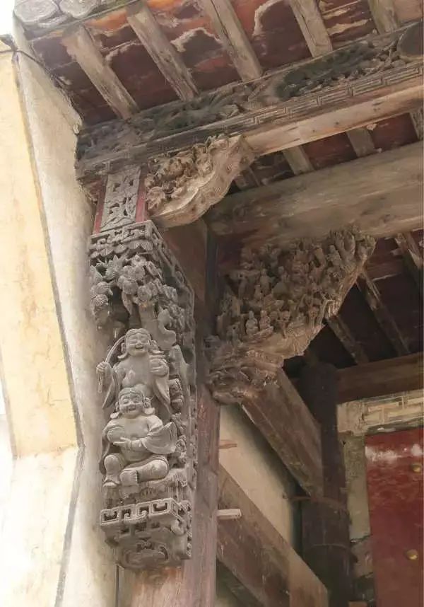 联络两垂柱的部件一般也有美雕,题材有“子孙万代”、“岁寒三友”、“玉棠富贵”、“福禄寿喜”等等,寄予着主人对美好生活的无限憧憬。
