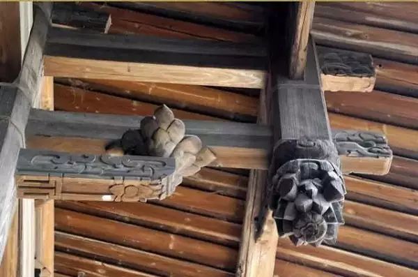 梁两端上面挖檩碗承檐檩,下面悬挑垂莲柱。其是两面完全对称的建筑,两面都有垂莲柱。