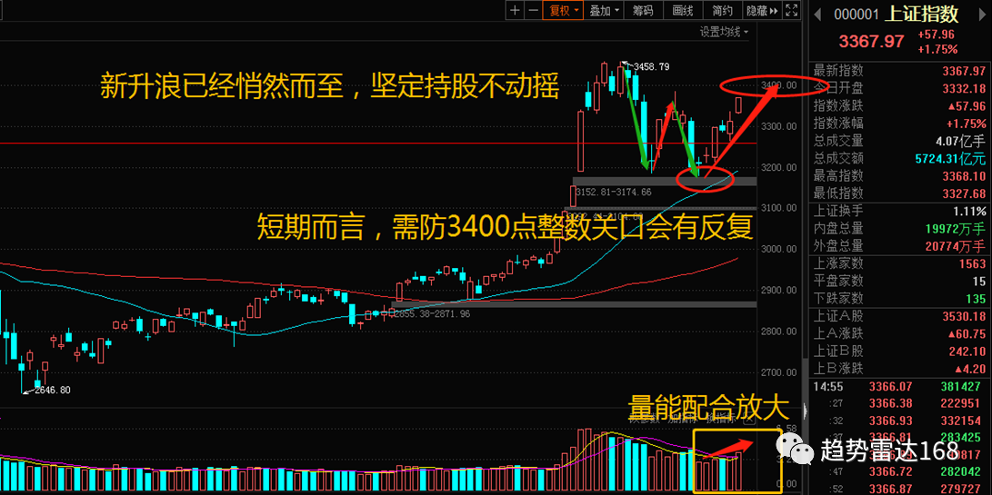 简单点来讲,明天重点关注3382点能否突破,一旦突破这里新升浪结构就基本确立,后续就耐心等大盘创新高即可。不过值得一提的是目前量能配合尚可,但是想要突破创新高还欠点火候,明天需防普涨之后的分化震荡,踏空者要注意谨慎追涨!达哥认为市场大概率会在3400点附近反复震荡换手后,再结合券商等权重股进行冲关,在此之前切记避免盲目追涨杀跌,潜伏等轮动上涨才是王道!