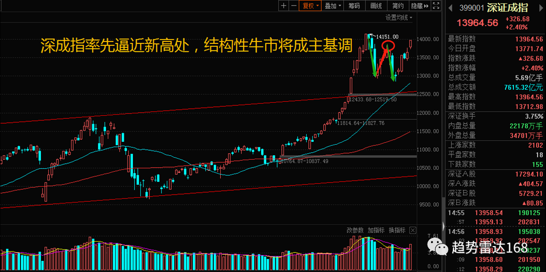 这里再给大家看深成指的日线走势图做对比,abc三浪式结构已经确认结束,因为b浪高点今天已经被突破,算是提前验证了这一波行情不是延伸浪。此外,深成指距离创新高也仅一步之遥,一旦深成指率先突破创新高,那么上证指数跟随创新高也将是大概率事件。届时大家需要做的就是注意大小盘股的新一轮切换问题了,这里建议留意下北向资金的动向,毕竟这一波八类股行情达哥在上周就结合北向资金的流向做过提示了(在微头条每天都有讲解),持续跟踪关注达哥的朋友应该是很清楚的。