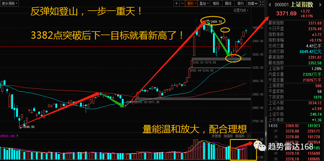 我们先来看看上证指数日线图的表现,这一波筑底反弹行情,达哥是一路提示过来了的,并且给了多个右侧进攻点位让大家逐步验证,直至今天盘中指数一举突破3382点,代表这里的浪型很显然不是abc结构的延伸浪了,因为这里的反弹已经突破b浪高点,不符合波浪理论延伸浪的定义了。那么换句话说,新升浪已经如期而至,接下来需要留意的高点就是3458.79点了,只有突破这里之后才能确立三浪5的浪型结构,而目前则属于三浪5的进程当中!