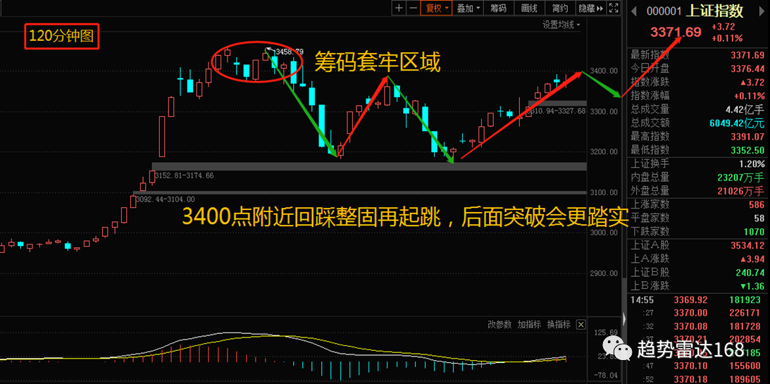 用一句诗词来形容就是——“不识庐山真面目,只缘身在此山中”!如果你还在苦等低点,只能说明你的交易体系里面纠错标准还需要进一步优化,否则就如前文达哥所言,踏空也是原则性风险的一种!说回盘面,目前上证指数日线图量价配合理想,不过需要留意的是3400点上方是7月初新股民跑步进场的套牢区,以当前的量能水平而言,强突难度比较大,同时也很容易引发短线获利盘和套牢盘的双重抛压。达哥认为这里如果能够在3400点附近回踩洗盘的话,不仅能够清洗短线获利浮筹,同时也会松动上方套牢筹码,这样一来后市再突破创新高压力会小很多,是短线相对概率较大的走势!