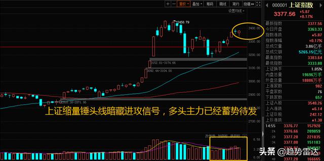 今天上证指数如期回踩5日均线后企稳回升,K线收出一根标准锤头线,量能同比明显萎缩,多头主力围绕3400点围而不攻的意图已经十分清晰!在昨日文章《3400点拉锯战尚未结束》中达哥就提示过——“这里金融股集体启动的话,跟7月初一样,不需要小盘股配合就能够直接带着指数飞,但是这种上涨需要增量资金的配合,简单点说就是放量,否则很容易形成假突破!另外一种情况则是大盘继续选择关前蓄势震荡,一方面等八类股短线节奏调平,另一方面等5日均线上移形成支撑,这样一来的话突破创新高的有效性会大增!”看到这里大家应该能够理解了吧,多头主力围而不攻主要是在蓄势,后面再择机突破应该是大概率事件了,结合今天的盘面表现来看,明天大盘上演红周四可期,还是老观点,这里不创新高的话坚决持股不下车!