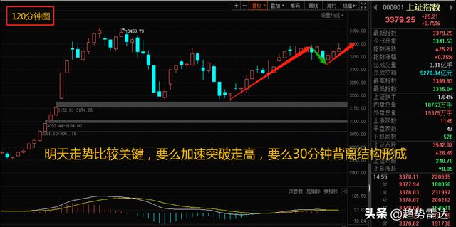 此外,今天的行情也并不是没有隐忧存在,结合量能来看这里明显属于缩量反弹性质,达哥只能说还好没形成突破,否则这种缩量突破第二天很容易遭受空头资金的抛压打击。达哥认为今天多头主力并没有在盘中借势冲击3400点整数关口,应该还是有借尾盘进一步清洗浮筹的原因存在,这一点从外资动向就可以清楚看到,连续两个交易日尾盘都是呈跳水杀跌走势,但是外资偏偏在尾盘半小时上演了突击抢筹,这种走势很明显是试盘+洗盘的结合手法。前面两个问题就简单回答到这里,下面我们重点结合120分钟图来推演下明天的行情走势!