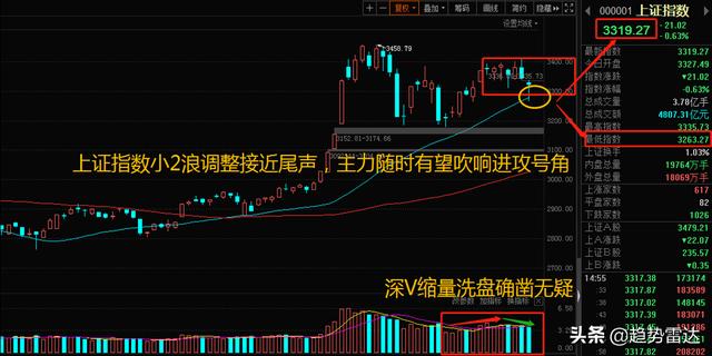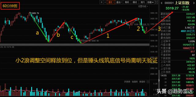考虑到篇幅问题,这里就不赘述昨日观点了,感觉文章衔接不够的请自行翻阅昨天文章!昨日达哥强调过短线先看3天的调整周期,空间支撑则锁定日线34天均线(短期趋势线),今天的探底锤头线已经直接验证了趋势线支撑,虽然时间还没有到,但是空间的下跌风险已经释放完毕。明天大盘指数能够报收红阳,基本就能够对今天的探底锤头线形成筑底验证,届时小2浪调整有望提前结束。