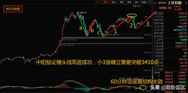 接下来我们再聊聊下周行情的高度问题,上图大家应该不陌生了吧,小2浪的调整早就说了需要中阳来确定调整结束,今天上证指数中阳突破3350点基本已经对锤头线的筑底信号做了验证。简单点说就是小2浪调整大概率结束了,不过小3浪还是要等突破3409.06点后才能确立,现在只能说大盘正运行在小3浪周期之内。按照波浪理论定义来讲,小3浪应该是主升加速浪,所以后续大盘如期走加速的话,3400和3458点基本都是小目标而已,大目标还是继续锁定3587点!