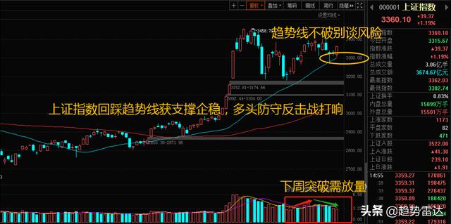 昨日上证指数收出地量十字星线后,达哥就强调短线多空决战将一触即发,今日果不其然,早盘探底3302.74点后,由金融股率先发力,直接打响了3300点的防守反击战役!红周五如期而至,不管是有先知先觉的资金搞事情,还是多头豪赌周末利好,起码技术信号显示目前多方占据主动态势,唯一美中不足的可能是量能没有跟上,那么下周大盘该何去何从呢?下面我们还是一起来看看今天技术面给我们传递了哪些信号!
