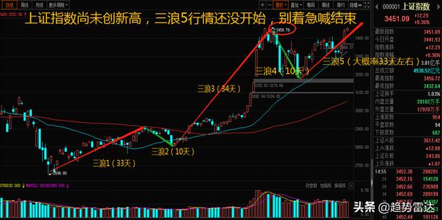 看上图,前文达哥也一直强调了,如果三浪4也调整10个交易日的话,这一波上涨和下跌的对称性是非常强的,而且都是直接对称,不复杂!那么大概率三浪5也会运行33个交易日左右,现在才运行了16个交易日,时间才刚过了一半,更安全的是新高未破,那么就说明三浪5还未确立,所以达哥想说的是三浪5还没开始,别着急喊“咔”。左侧风险警示点主要来自于5浪+大周期的顶背离结构,现在5浪还没确立,背离也才刚刚形成,形成结构了再说风险,没有形成之前安心持股!